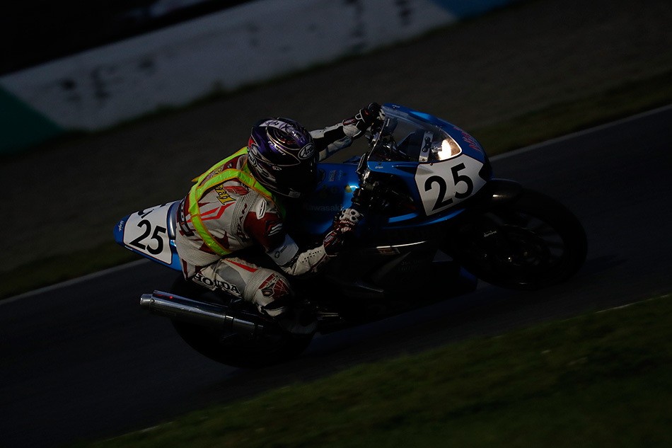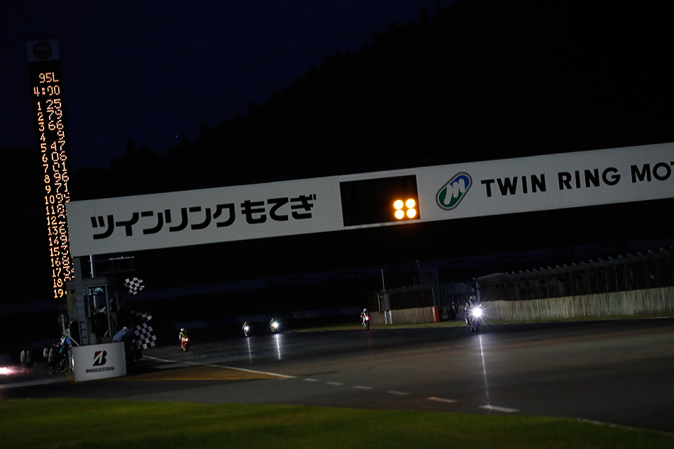 Then, the 4-hour endurance race with the first-ever night session in Mote tai history started at 3pm with 70 teams that failed to pass the qualifying. The holeshot was taken by #9 PUTO Densetsu, but the rider who returned first after the opening lap was Hiromichi Kunikawa of #25 BF&RASH. As an active international license Rider, his speed was truly impressive. #9 PUTO Densetsu was running in second place, but behind them, Asahi Komuro of #147 team Kizo*Eiwa & moto1/4, also an active international license Rider, was closing in. Although they exchanged positions several times, Komuro was faster. After #9 PUTO Densetsu made their first pit stop, #25 BF&RASH and #147 team Kizo*Eiwa & moto1/4 held first and second place. These two teams were running a strategy to fully utilize their international license Riders. Meanwhile, #66 Riding Sports & KISS maintained consistent speed and was leading after 3 hours had passed. The last stint was handled by Karen Ogura, who returned to the course still in the lead. At this point, victory was almost in their grasp... However, with 30 minutes remaining, they received a penalty for overtaking under a yellow flag and dropped in position. This allowed #79 Shonan FRP & RacingGarageSTR to take the lead, but there was a Rider making a furious charge from behind. It was Kunikawa of #25 BF&RASH. "I didn’t know if the fuel would last until the end, but I was only thinking about winning," Kunikawa said after the finish. With 5 minutes left, he overtook #79 Shonan FRP & RacingGarageSTR to take the lead and went on to receive the checkered flag, winning the 4-hour endurance race.