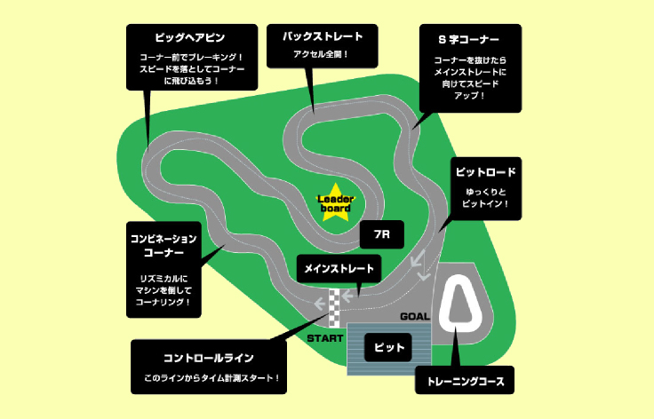 一見難しく感じるこのコースですが、リズミカルにマシンを倒しながらコーナリングすることで、最速タイムを打ち出すことができます。